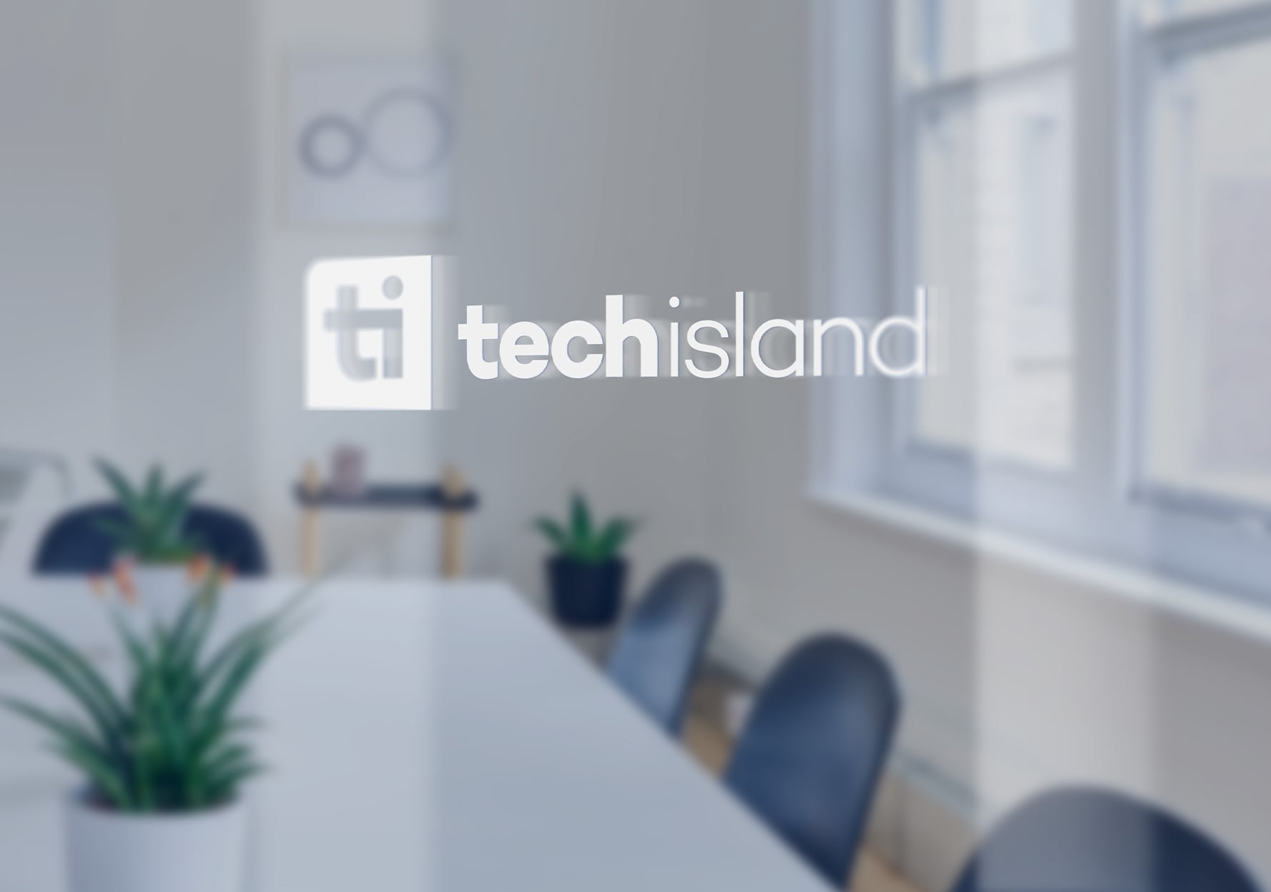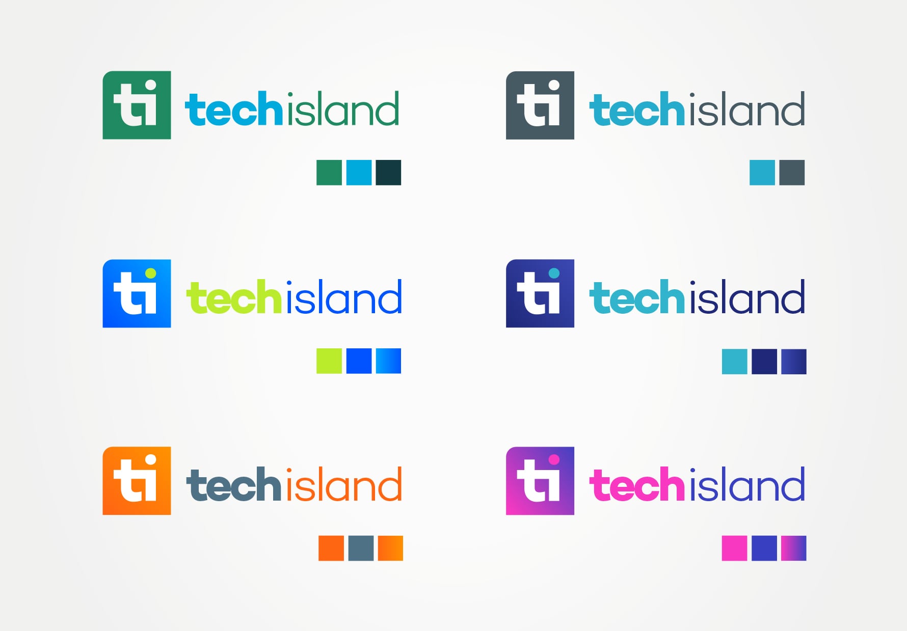 Versions of the Tech Island logo; positive, reversed, and on top of an image.